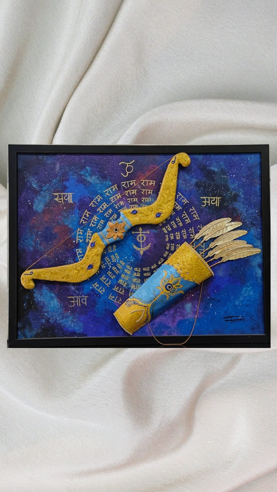 Medium & Style: This appears to be a 3D relief piece where the bow and quiver are raised from the canvas. The use of metallic gold against the dark, shimmering background gives it a regal and devotional feel.
