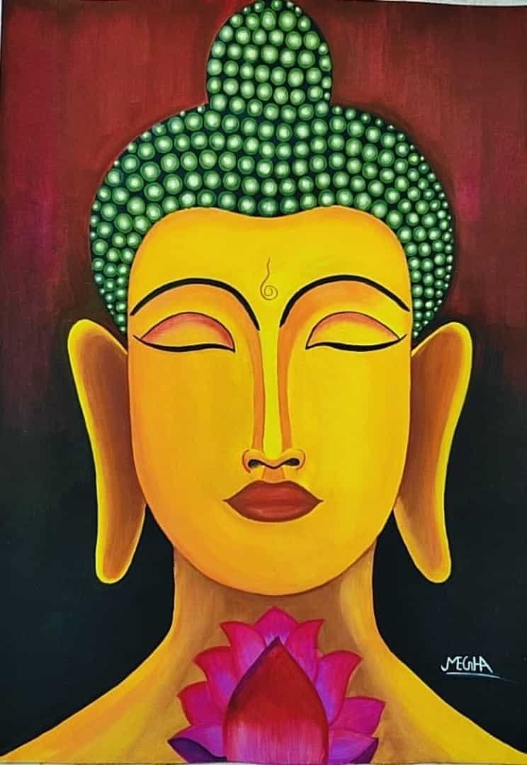 A vibrant Buddha portrait warm golden hues , with closed eyes symbolizing peace and meditation. The textured green hair and blooming pink lotus add depth, purity, and spiritual calm to the composition.