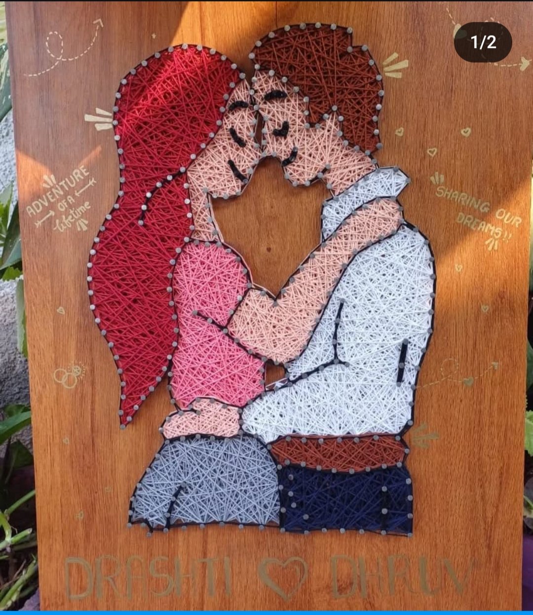 A handcrafted string art piece capturing the beautiful connection between two hearts. Designed with colorful threads on a wooden base, forming a heart shape between the couple — symbolizing love, trust, and togetherness. Perfect for anniversaries or special gifts.