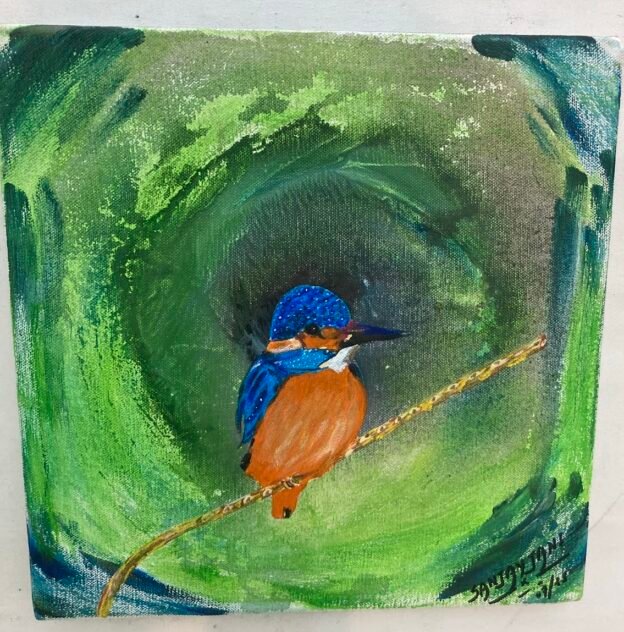 This artwork captures the peaceful beauty of nature with wide green fields, tall trees, a flowing river, and quiet mountains in the background. The soft colors and gentle textures create a calm and relaxing feeling. It reminds us to slow down, breathe deeply, and enjoy the simple moments that nature offers. The winding path and river also symbolize life’s journey, full of calm turns and quiet hope.