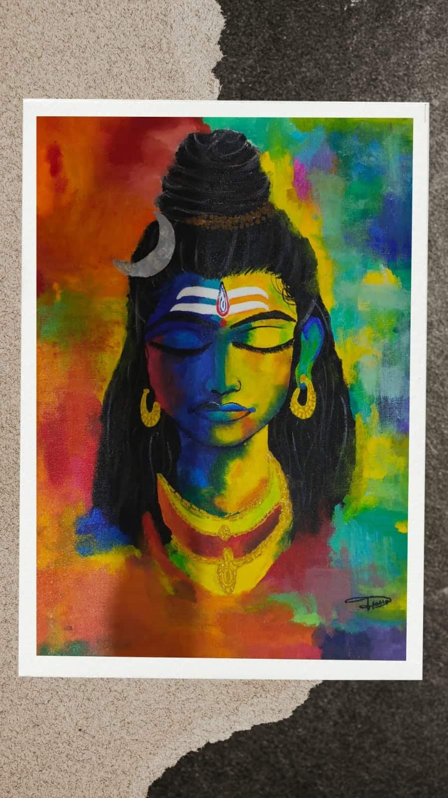 Background: An “explosion” of abstract, multi-colored brushstrokes in shades of red, orange, teal, and purple. The messy, expressive background makes the central figure pop with a divine, radiating glow.