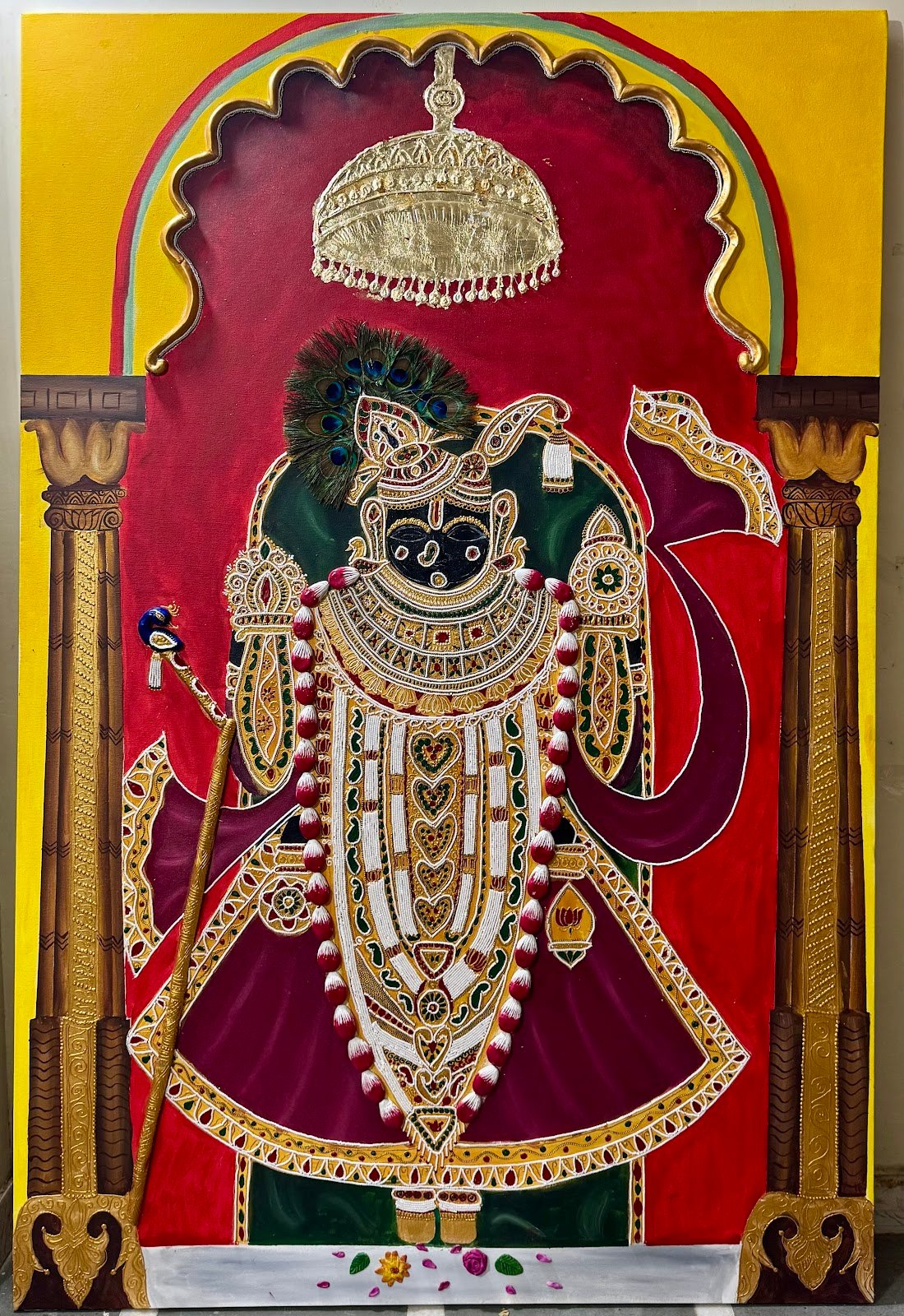 The Signature Posture: Shrinathji is shown in his iconic pose with his left arm raised, symbolizing the lifting of Govardhan Hill to protect the people of Braj.
