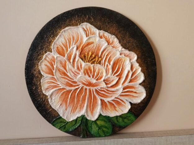 Central Subject: The artwork depicts a multi-petaled flower, possibly a peony or a rose, in full bloom. The petals are rendered with a heavy impasto or relief technique, giving them a physical, three-dimensional depth that rises off the surface.