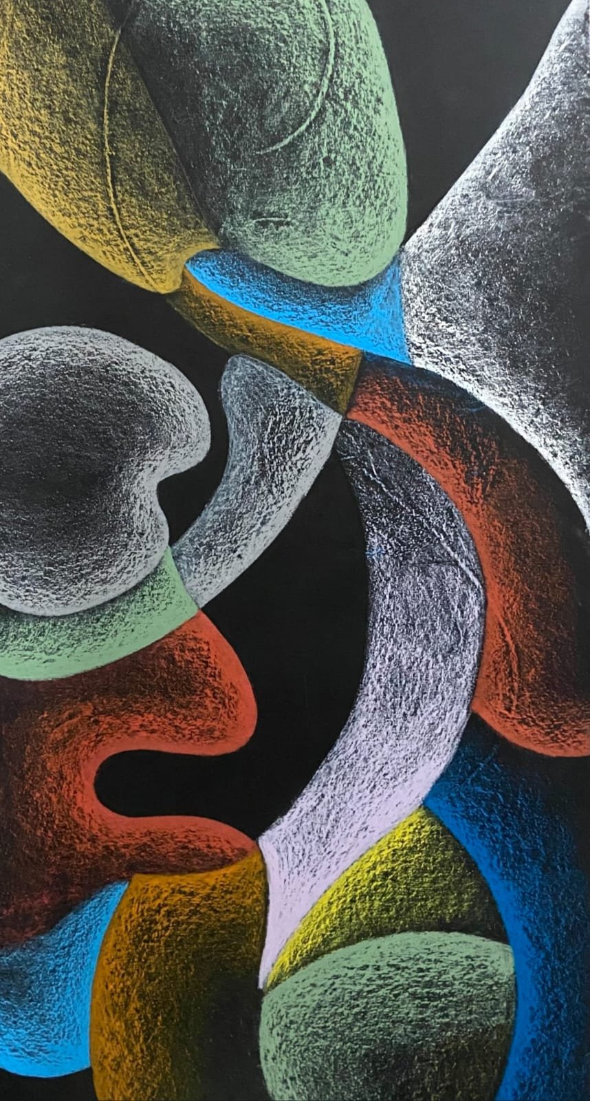 This artwork is an abstract figurative composition made of flowing, organic forms and bold, vibrant colors. The shapes suggest the human body and natural elements without defining them clearly, creating a sense of movement and emotional energy. Strong contrasts between warm and cool tones add depth, while the textured surface enhances its organic, tactile feel. Overall, the work explores connection, transformation, and inner motion, inviting personal interpretation from the viewer.