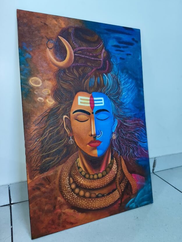 This 30 × 45 inch handmade canvas painting portrays the dual nature of Lord Shiva—destruction and serenity. One side reflects the powerful Rudra energy, symbolizing transformation and cosmic force, while the other side represents Shiva’s calm and meditative presence. The contrast of warm earthy tones and deep cosmic blue highlights the balance between power and peace, capturing the eternal harmony within the divine.