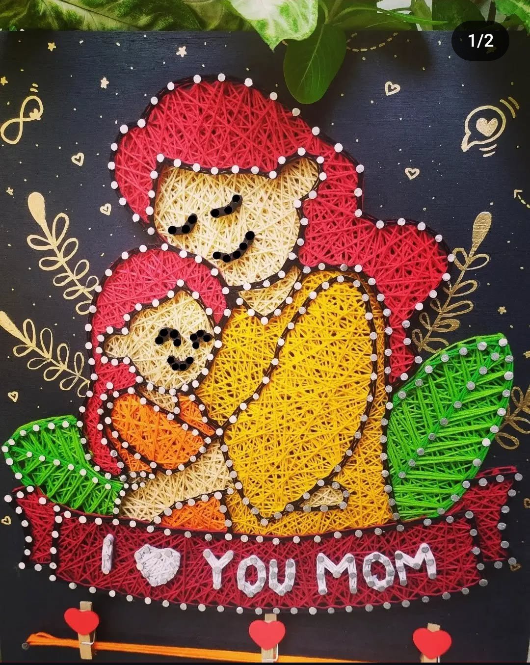Handcrafted string art made with nails and thread celebrating the pure bond between mother and child. Made with vibrant threads and delicate detailing on a wooden base, symbolizing warmth, protection, and unconditional love.