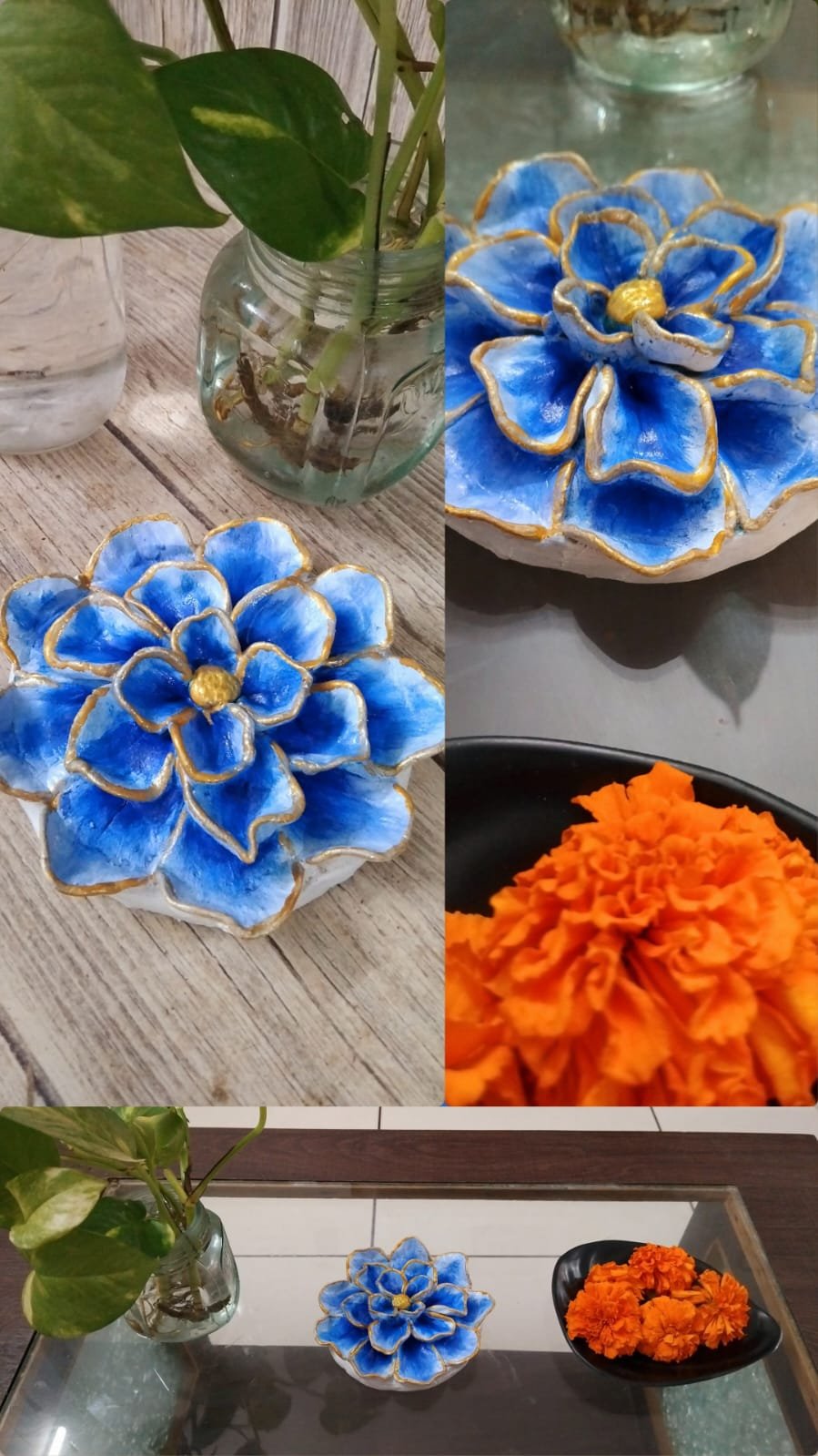 Handmade moulded beautiful desktop home decore Blue Flower, royal colour with golden ends create a royal look….