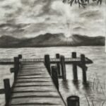The drawing uses a one-point perspective, leading the viewer’s eye down a weathered wooden pier toward a distant mountain range on the horizon  A soft, radiant sun is setting behind the mountains, with visible light rays stretching upward into a dramatic, cloudy sky. In the upper right corner, dark, silhouetted tree branches hang over the scene, framing the top of the composition Tall, wispy marsh grass is visible in the lower right foreground, growing near the base of the dock. The water surface is rendered with light, horizontal strokes to suggest gentle ripples and the reflection of the sun’s light.