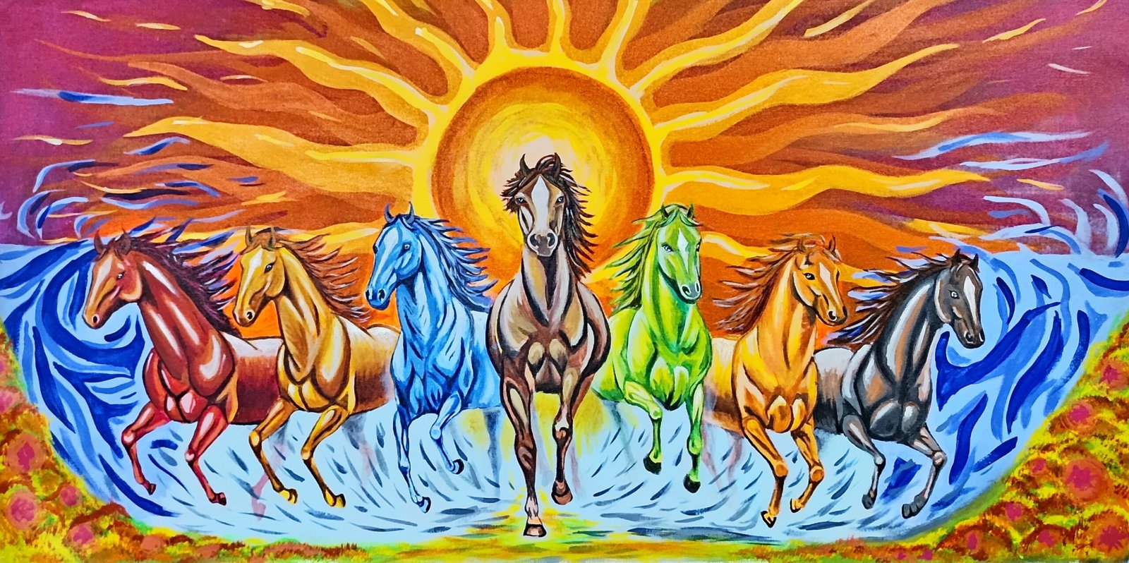 • Diverse Color Palette: Unlike traditional versions that often feature white horses, this artist has used a bold, symbolic spectrum including red, gold, blue, brown, green, orange, and black.